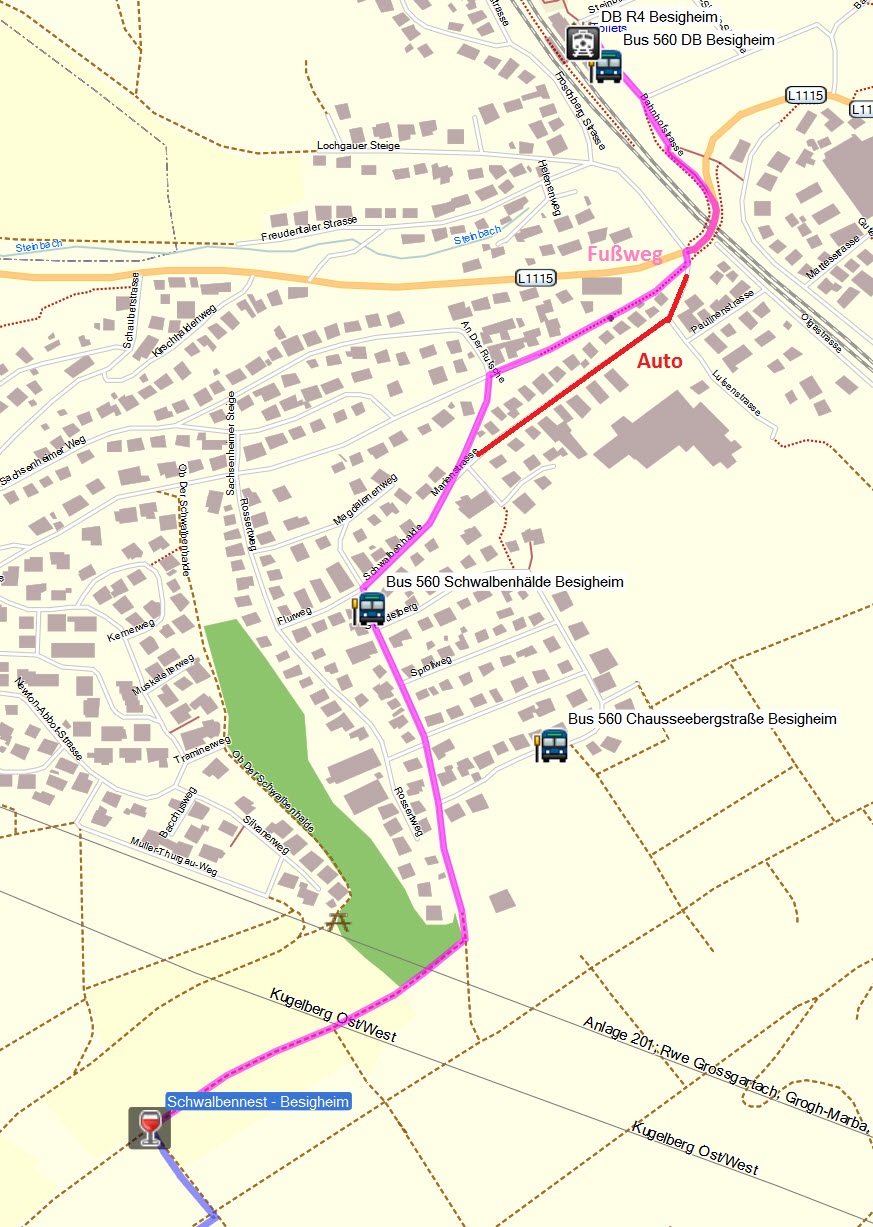 Bahnhof Besigheim dann zu Fuß 1,4 km bis zur Besenwirtschaft Schwalbennest, oder mit dem Bus 640 zur Haltestelle Schwalbenhälde oder Chaussebergstraße und dann weiter zu Fuß auf der Schwalbenhälde, am letzten Haus rechts unterhalb der Weinberge bis zur Besenwirtschaft Schwalbennest.